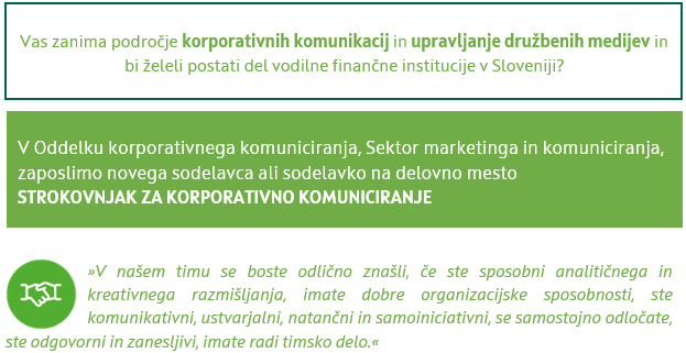 - sodelovanje pri upravljanju profilov banke v družbenih medijih ter skrb za pripravo objav in njihovo optimizacijo